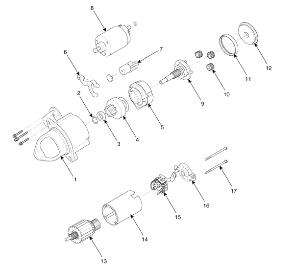 1. Front bracket 2. Stop ring 3. Stopper 4. Overrun clutch assembly 5. Internal gear assembly 6. Lever 7. Lever stop 8. Magnet switch assembly 9. Driv ...