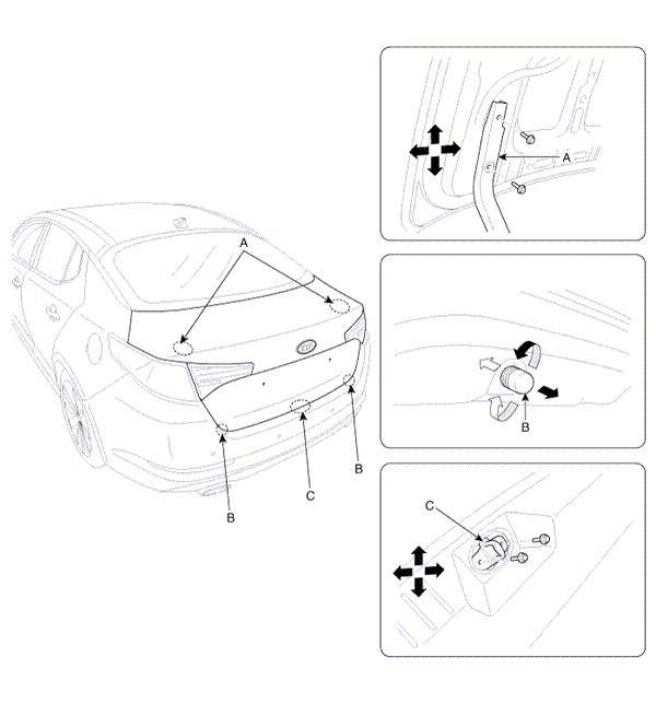 Kia Optima: Adjustment| 1. | After loosening the trunk lid hinge (A) mounting bolt, adjust the trunk lid by moving it up or down, or right or left. |