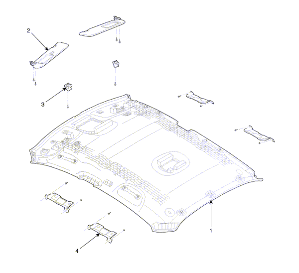 1. Roof trim 2. Sunvisor 3. Retainer 4. Assist handle bracket ...
