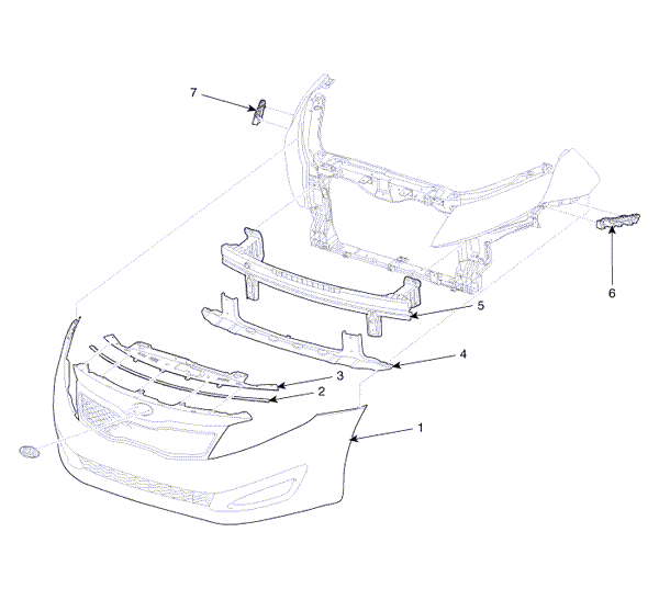 1. Front bumper cover 2. Front bumper lip assembly 3. Radiator grill 4. Front bumper lower side molding 5. Front fog lamp 6. Wiring harness assembly 7. Front b ...