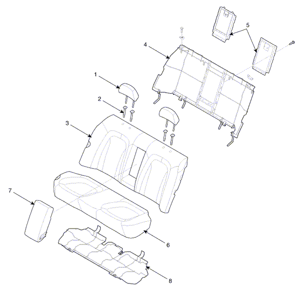1. Headrest 2. Headrest guide 3. Rear side cover 4. Rear side frame assembly 5. Rear seat back cover 6. Rear back armrest 7. Rear seat cushion cover 8. Rear ...