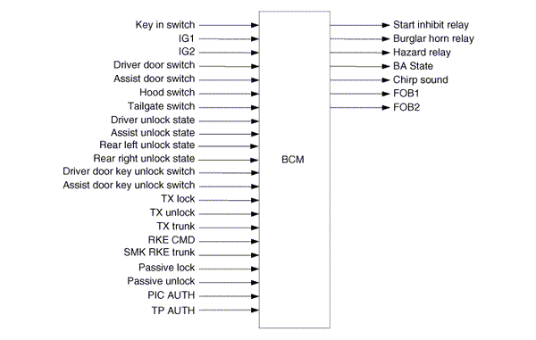 For the system to arm, the ignition switch must be off and the key removed. Then, the body control module must receive signals that the doors, hood, and trunk lid are closed and locked. When everything is closed and locked, none of the control unit inputs are grounded. The door switches, hood switch and trunk lid switch are all close and lock the doors with the remote transmitter and then the system arms after 30 second. If anything is opened or improperly unlocked after the system is armed, the body control module gets a ground signal from that switch, and the system is set off.