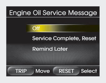 2. If you would like to reset or inactivate the maintenance system press the RESET button for more than 1 second. The display will change to "Engine Oil Service Message" mode.