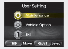 1. When the vehicle is at a standstill, pressing the TRIP button for more than 2 seconds with the ENGINE START/ STOP button in the ON position or engine running, the LCD display on the cluster will change to the "User Setting" mode.