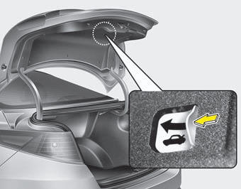 Your vehicle is equipped with an emergency trunk release lever located inside the trunk. If someone is inadvertently locked in the trunk, moving the handle in the direction of the arrow will release the trunk latch mechanism and open the trunk.
