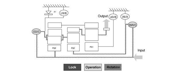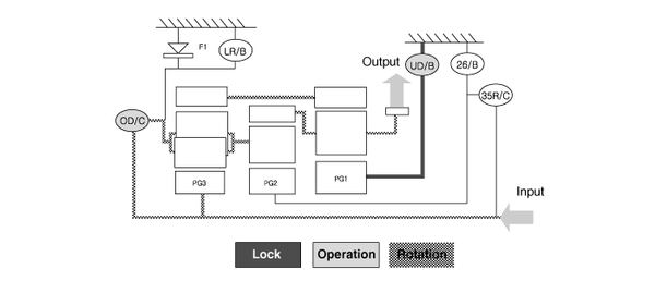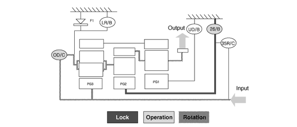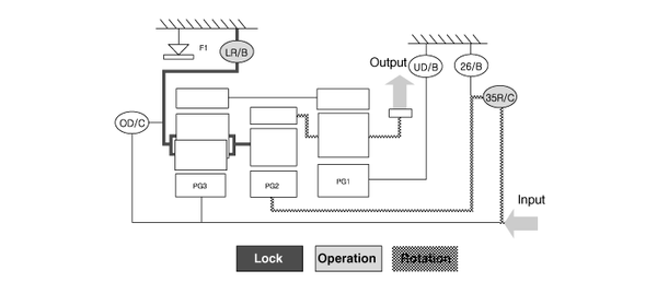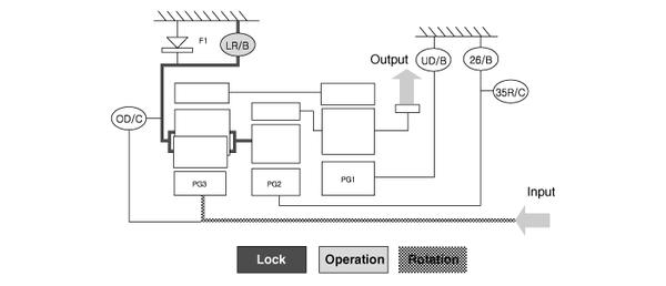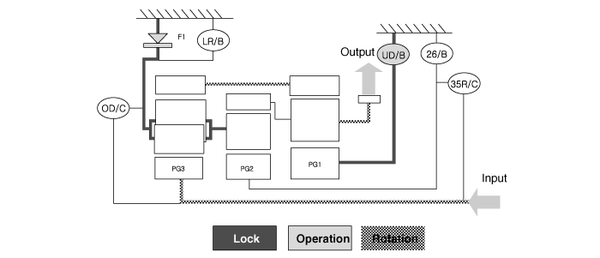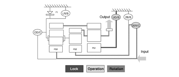 ▶Input Shaft Rotation → Rear Sun Gear Rotation → Rear Inner Pinion Rotation (Reverse) → Rear Outer Pinion Rotation → Rear Annulus Gear Rotation → Front Annulus Gear Rotation → Front Pinion Rotation → Front Sun Gear Rotation (Reverse) → Underdrive (U/D) Hub Rotation (Reverse)▶Input shaft rotation → Overdrive Clutch (OD/C) Retainer Rotation