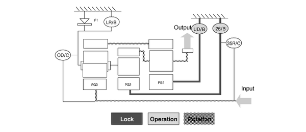 ▶ When the rear sun gear is rotated, power is reduced at the rear planetary gear and then delivered to the rear and front annulus gears. The power is then reduced again at the front planetary gear, whose sun gear is locked in place, and then delivered to the front carrier.▶ Here, the middle annulus gear, which comprises of a single unit with the front carrier, rotates and results in reverse, zero load rotation of the middle sun gear.