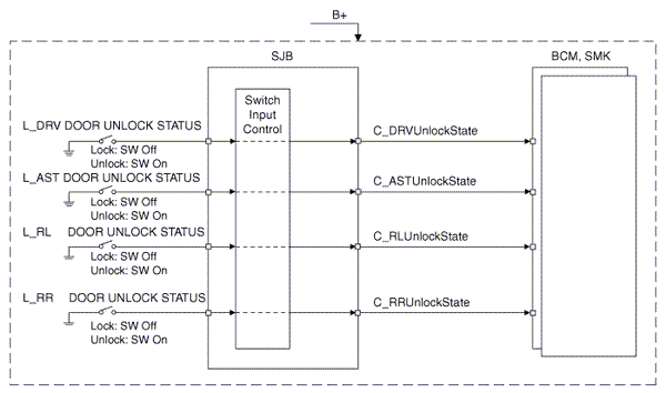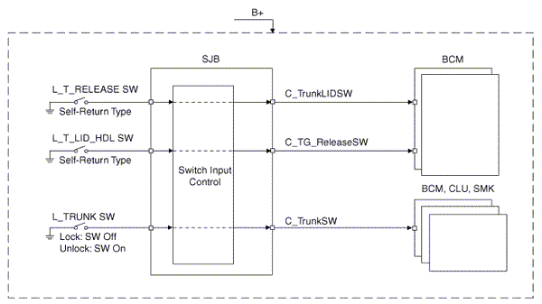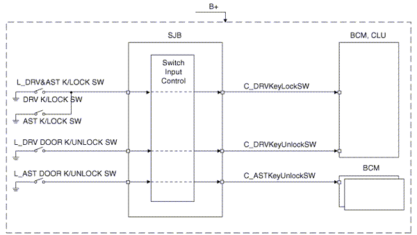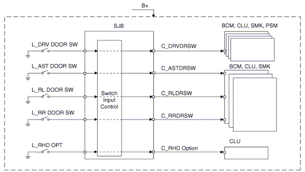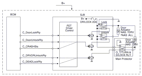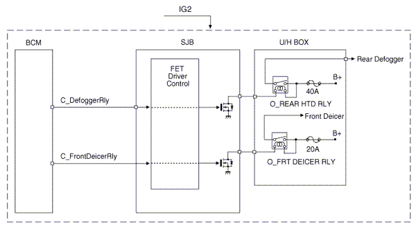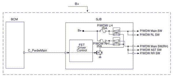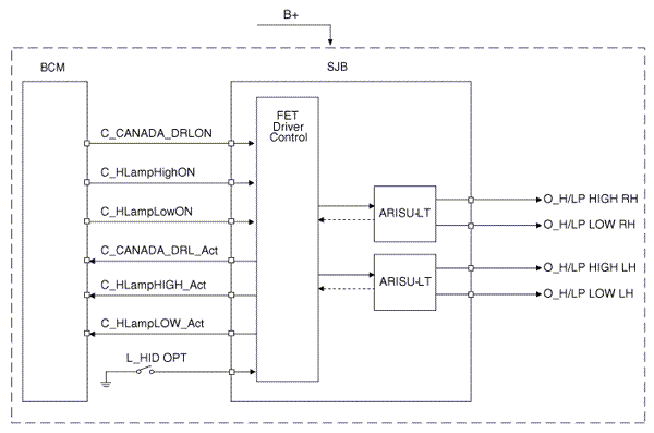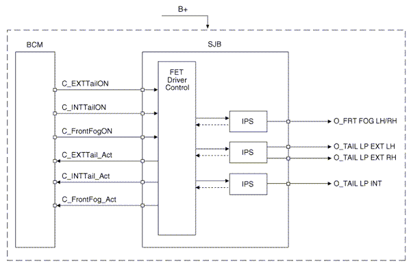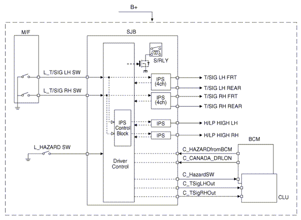 The BCM controls IPS and relay on the SJB. For example, if BCM requests head lamp low beam control, then BCM requests related lamp control at one time.