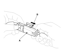 To release the lock, pull the spring-loaded sleeve (A) and the slider (B), while
