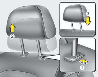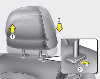 To raise the headrest, pull it up to the desired position (1). To lower the headrest, push and hold the release button (2) on the headrest support and lower the headrest to the desired position (3).