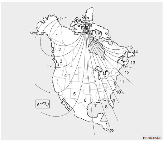 There is a difference between magnetic north and true north. The compass in the mirror can compensate for this difference when it knows the Magnetic Zone in which it is operating. This is set either by the dealer or by the user. The operating Zone Numbers for North America are shown in the figure on the following section.