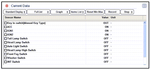 Kia Optima: Inspection (With GDS)| 1. | Check BCM input/output specification of multifunction switch using the GDS. If the specification is abnormal, replace the lamp or wiper switch. |