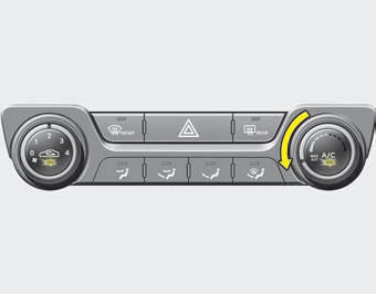 To operate the MAX A/C, turn the temperature knob to extreme left. Air flow is directed toward the upper body and face. In this mode, the air conditioning and the recirculated air position will be selected automatically.