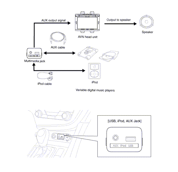 The multimedia jack on the console upper cover is for customers who like to listen to external portable music players like the MP3, iPod and etc., through the vehicle's sound system when it is linked to this jack. The customer has this added option.In case of distortions from media connected to the AUX source, the audio unit may not be defective but the output level of the used media does not match the specification of the AUX input.
