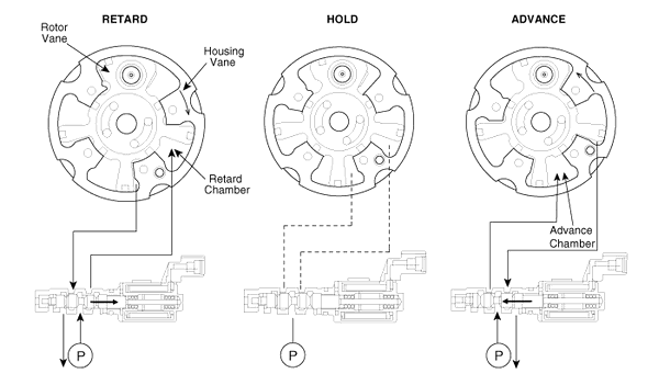 Kia Optima: Operation PrincipleThe CVVT has the mechanism rotating the rotor vane with hydraulic force generated by the engine oil supplied to the advance or retard chamber in accordance with the CVVT oil control valve control.