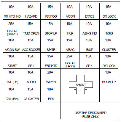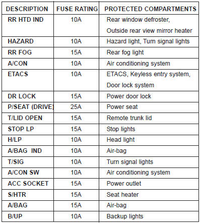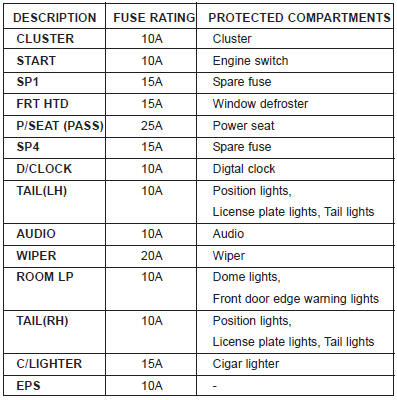 Kia Optima: Passenger Compartment Fuse Panel Description (Driver’s side kick panel)
