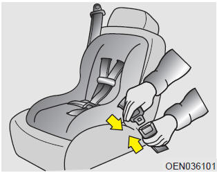 To remove the child restraint, press the release button on the buckle and then pull the lap/shoulder belt out of the restraint and allow the seat belt to retract fully.