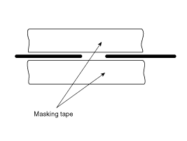 | 5. | Using a thin brush: Wipe the glass adjacent to the broken heater line, clean with silicone remover and attach the masking tape as shown. Shake the conductive paint container well, and apply three coats with a brush at intervals of about 15 minutes apart. Remove the tape and allow sufficient time for drying before applying power. For a better finish, scrape away excess deposits with a knife after the paint has completely dried. (Allow 24 hours).
