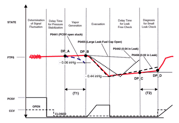 The PCSV is closed and the system waits for a period to get stabilized pressure. During checking period (T2), the system measures the beginning and the end of the system pressure (DP_C, DP_D). The diagnosis value is the pressure difference corrected by the natural vapor generation (DP_B - DP_A) rate from the vapor generation check step.