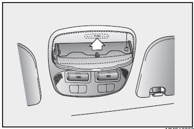 A compartment is provided at the overhead console to store sunglasses. To open the sunglass holder, press the cover and the holder will slowly open. Place your sunglasses in the compartment door with the lenses facing out.