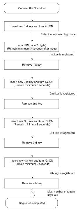 Kia Optima: Teaching Procedures| 1. | Key Teaching Procedure Key teaching must be done after replacing a defective PCM(ECM) or when providing additional keys to the vehicle owner. The procedure starts with an PCM(ECM) request for vehicle specific data (PIN code: 6digits) from the tester. The "virgin" PCM(ECM) stores the vehicle specific data and the key teaching can be started. The "learnt" PCM(ECM) compares the vehicle specific data from the tester with the stored data. If the data are correct, the teaching can proceed. If incorrect vehicle specific data have been sent to the PCM(ECM) three times, the PCM(ECM) will reject the request of key teaching for one hour. This time cannot be reduced by disconnecting the battery or any other manipulation. After reconnecting the battery, the timer starts again for one hour.The key teaching is done by ignition on with the key and additional tester commands. The PCM(ECM) stores the relevant data in the EEPROM and in the transponder. Then the PCM(ECM) runs the authentication required for confirmation of the teaching process. The successful programming is then confirmed by a message to the tester. If the key is already known to the PCM(ECM) from a previous teaching, the authentication will be accepted and the EEPROM data are updated. There is no changed transponder content (this is impossible for a learnt transponder). The attempt to repeatedly teach a key, which has been taught already during the same teaching cycle, is recognized by the PCM(ECM). This rejects the key and a message is sent to the tester. The PCM(ECM) rejects invalid keys, which are presented for teaching. A message is sent to the tester. The key can be invalid due to faults in the transponder or other reasons, which result from unsuccessful programming of data. If the PCM(ECM) detects different authenticators of a transponder and an PCM(ECM), the key is considered to be invalid. The maximum number of taught keys is 8 If an error occurs during the Immobilizer Service Menu, the PCM(ECM) status remains unchanged and a specific fault code is stored. If the PCM(ECM) status and the key status do not match for teaching of keys, the tester procedure will be stopped and a specific fault code will be stored at PCM(ECM).