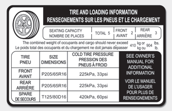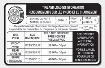 The label located on the driver's door sill gives the original tire size, cold tire pressures recommended for your vehicle, the number of people that can be in your vehicle and vehicle capacity weight.