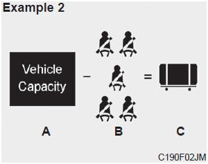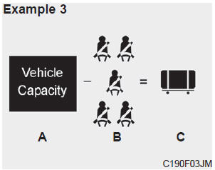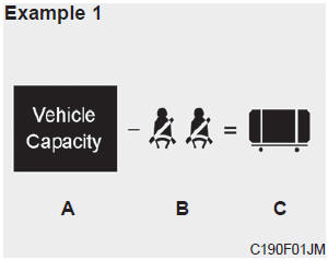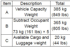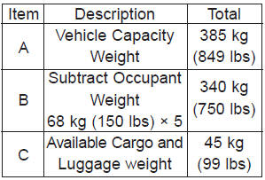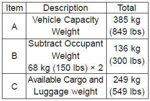 4. The resulting figure equals the available amount of cargo and luggage load capacity. For example, if the "XXX" amount equals 635 kg (1400 lbs.) and there will be five 68 kg (150 lbs.) passengers in your vehicle, the amount of available cargo and luggage load capacity is 295 kg (650 lbs). (635-340 (5 x 68) = 295 kg or 1400-750 (5 x 150) = 650 lbs.)
