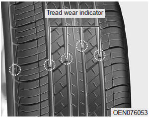If the tire is worn evenly, a tread wear indicator will appear as a solid band across the tread. This shows there is less than 1.6 mm (1/16 inch) of tread left on the tire. Replace the tire when this happens.