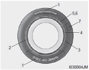 Any tires that are over 6 years old, based on the manufacturing date, (including the spare tire) should be replaced by new ones. You can find the manufacturing date on the tire sidewall (possibly on the inside of the wheel), displaying the DOT Code. The DOT Code is a series of numbers on a tire consisting of numbers and English letters. The manufacturing date is designated by the last four digits (characters) of the DOT code.