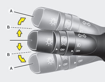 The ignition switch must be on for the turn signals to function. To turn on the turn signals, move the lever up or down (A). The green arrow indicators on the instrument panel indicate which turn signal is operating. They will self-cancel after a turn is completed. If the indicator continues to flash after a turn, manually return the lever to the OFF position.