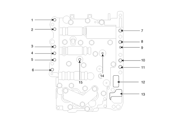 9. Lubrication(front) 10. 35R clutch pressure 11. 26 brake pressure 12. From oil pump 13. To oil pump 14. Underdrive pressure 15. Low & reverse pressure |